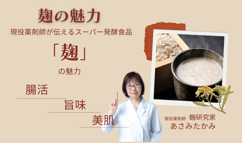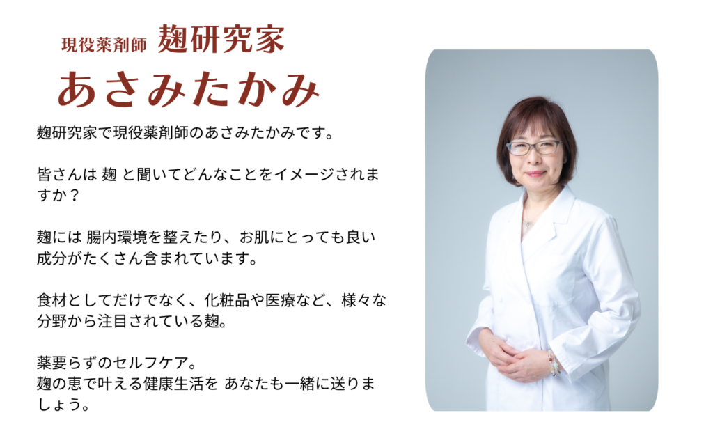 そして「腸活」「免疫力アップ」などの従来よりしられている効果だけでなく薬剤師あさみの視点から薬との飲み合わせ、疾患との関係など「古くて新しい 麹のある生活」のご提案致します。