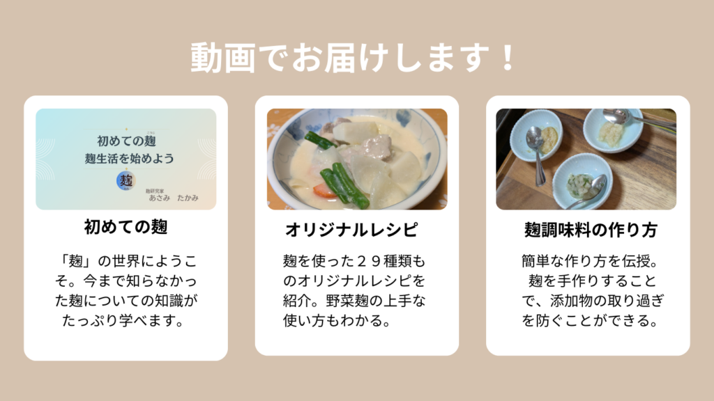 麹の基本からすぐに使える方法まで、初心者でもすぐ実践できて、安心して取り入れられる麹生活の第一歩をお届けします。